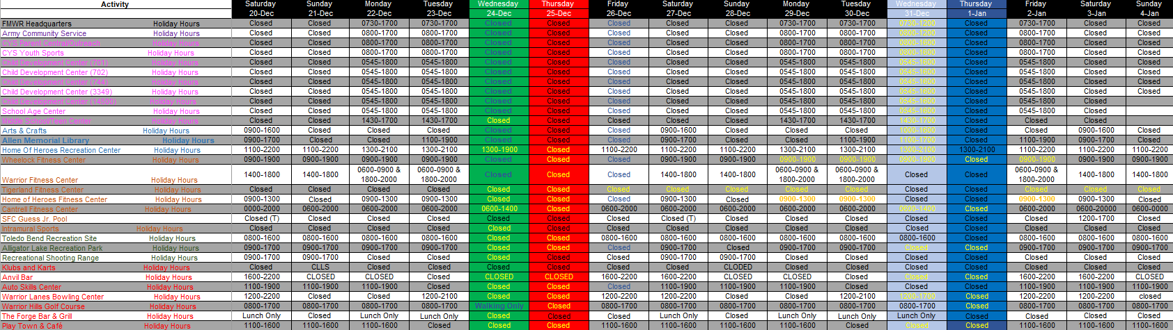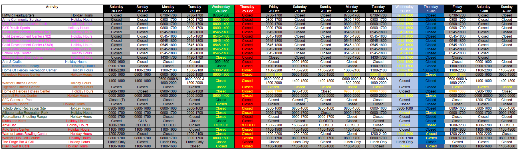 Find all FMWR Facility Hours for Holiday Block Leave here!