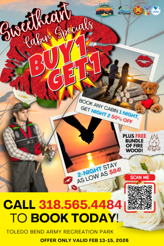 Save BIG on cabin rentals this Valentine's Day at Toledo Bend!