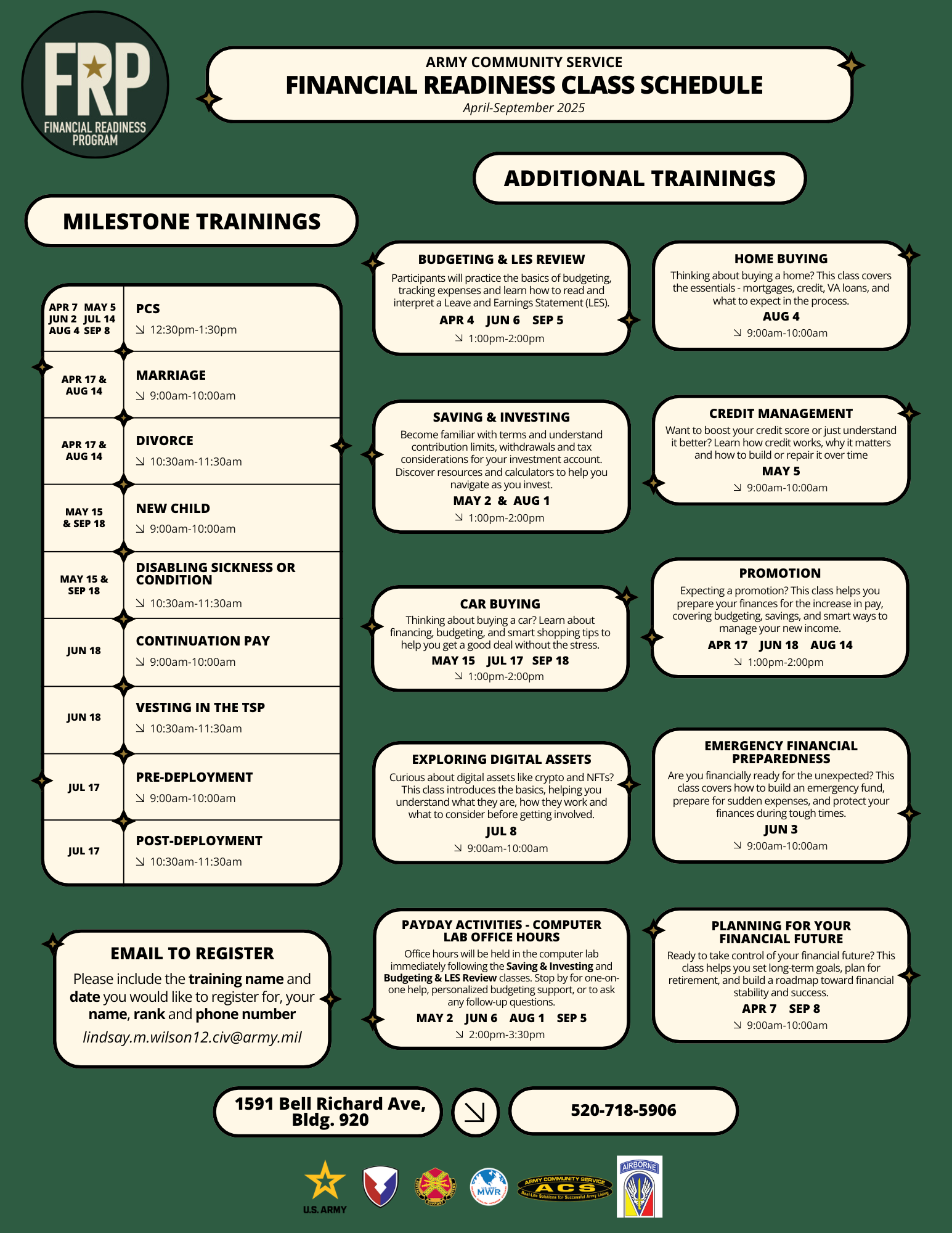Click the link to the corresponding training below, and an email will generate to our Financial Readiness Team. Please refer to our calendar, include the training name and date, your first and last name, and a phone number in the registration request.